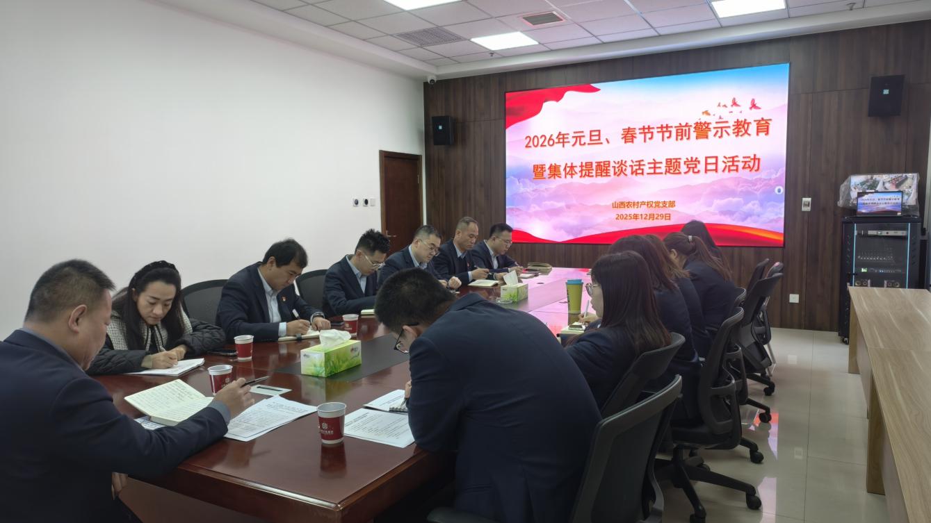 为深入贯彻落实全面从严治党要求,切实筑牢廉洁防线,保障元旦、春节期间各项工作平稳有序开展,2025年12月29日,山西农村产权党支部开展2026年元旦、春节节前警示教育暨集体提醒谈话主题党日活动,全体党员、积极分子、统战对象及群众全员参会。