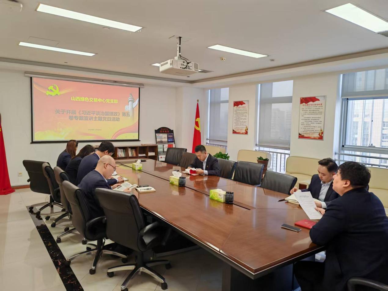 为深入贯彻落实山西交易集团党委关于学习《习近平谈治国理政》第五卷的部署要求,2025年11月28日,山西绿色交易中心党支部以“深学笃用党的创新理论,奋力谱写山西高质量发展绿色篇章”为主题,组织全体员工开展了专题宣讲主题党日活动